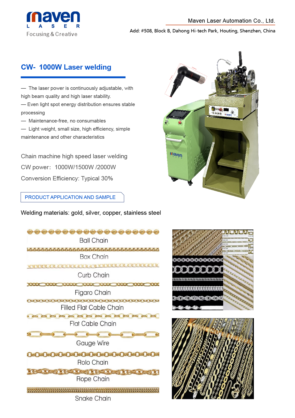 Primarily used for producing various metal chains such as single-clasp sideways chains, double-clasp chains, and cross chains. It is suitable for mass production of jewelry chains (e.g., necklaces and bracelets) in the jewelry industry, as well as processing common metal chains in the hardware accessories field. Additionally, it plays a role in chain repair and personalized chain customization scenarios, such as repairing broken precious metal chain links or customizing special-style chains like twisted chains and spliced chains.