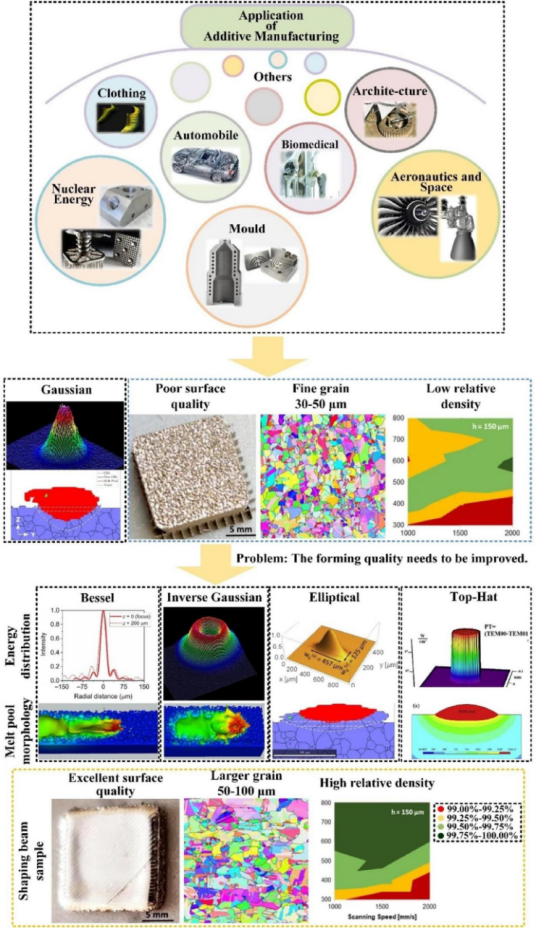Laser additive manufacturing (AM) technology, with its advantages of high manufacturing accuracy, strong flexibility, and high degree of automation, is widely used in the manufacturing of key components in fields such as automotive, medical, aerospace, etc. (such as rocket fuel nozzles, satellite antenna brackets, human implants, etc.). This technology can greatly improve the combination performance of printed parts through integrated manufacturing of material structure and performance. At present, laser additive manufacturing technology generally adopts a focused Gaussian beam with a high center and low edge energy distribution. However, it often generates high thermal gradients in the melt, leading to the subsequent formation of pores and coarse grains. Beam shaping technology is a new method to solve this problem, which improves printing efficiency and quality by adjusting the distribution of laser beam energy.