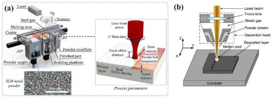 Laser metal additive manufacturing technology can be further divided into LPBF and DED. Figure 1 shows a typical schematic diagram of LPBF and DED processes. The LPBF process, also known as Selective Laser Melting (SLM), can manufacture complex metal components by scanning high-energy laser beams along a fixed path on the surface of a powder bed. Then, the powder melts and solidifies layer by layer. The DED process mainly includes two printing processes: laser melting deposition and laser wire feeding additive manufacturing. Both of these technologies can directly manufacture and repair metal parts by synchronously feeding metal powder or wire. Compared to LPBF, DED has higher productivity and larger manufacturing area. In addition, this method can also conveniently prepare composite materials and functionally graded materials. However, the surface quality of parts printed by DED is always poor, and subsequent processing is needed to improve the dimensional accuracy of the target component.