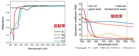 The above figure shows the relationship curve between the reflectivity, absorbance, and wavelength of commonly used metals at room temperature. In the infrared region, the absorption rate decreases and the reflectivity increases with the increase of wavelength. Most metals strongly reflect 10.6um (CO2) wavelength infrared light while weakly reflect 1.06um (1060nm) wavelength infrared light. Metal materials have higher absorption rates for short wavelength lasers, such as blue and green light.