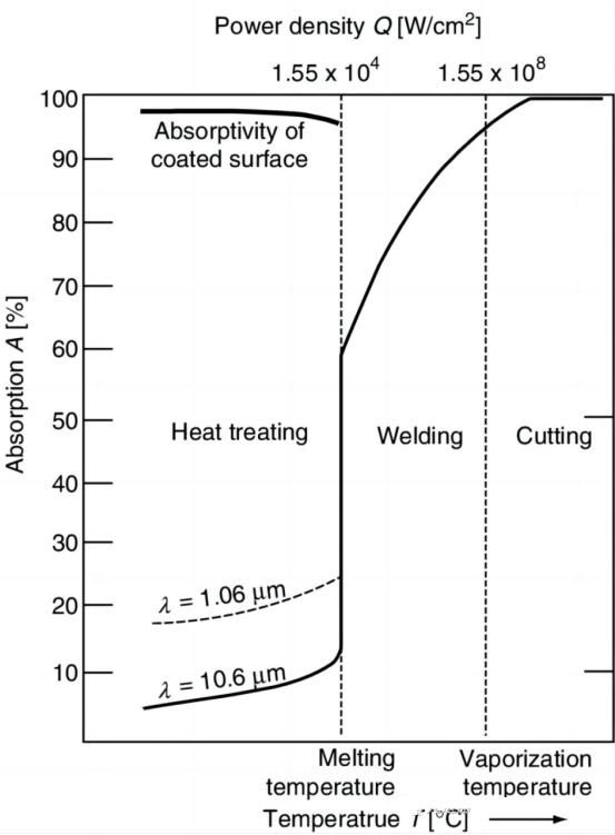 In terms of the absorption of laser by materials, the vaporization of materials is a boundary. When the material does not undergo vaporization, whether in the solid or liquid phase, its absorption of laser only changes slowly with the increase of surface temperature; Once the material vaporizes and forms plasma and keyholes, the material’s absorption of laser will suddenly change.