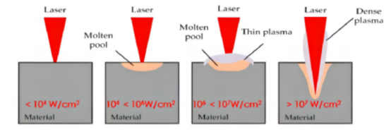 The laser processing of metal materials is mainly based on the thermal processing of photothermal effects. When laser irradiation is applied to the material surface, various changes will occur in the surface area of the material at different power densities. These changes include surface temperature rise, melting, vaporization, keyhole formation, and plasma generation. Moreover, the changes in the physical state of the material surface area greatly affect the material’s absorption of laser. With the increase of power density and action time, the metal material will undergo the following changes in state: