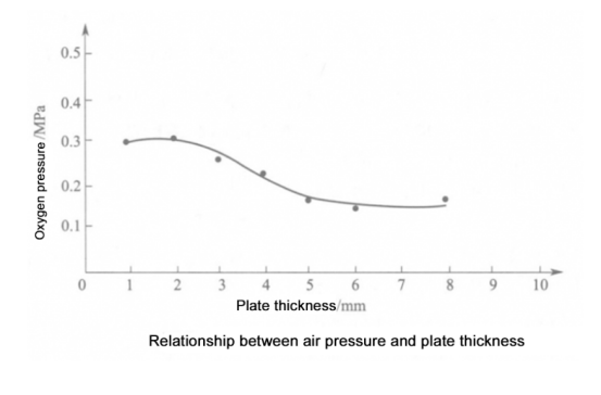 The body pressure also depends on the plate thickness. When cutting low carbon steel with a 1kW CO2 laser, the relationship between oxygen pressure and plate thickness is shown in the figure below.