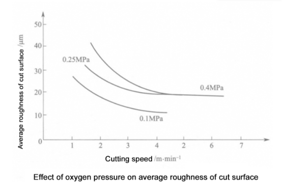 (2) Type and pressure of auxiliary gas When cutting low carbon steel, CO2 is used as auxiliary gas to utilize the heat of iron-oxygen combustion reaction to promote the cutting process. The cutting speed is high and the incision quality is good, especially the incision without sticky slag can be obtained. When cutting stainless steel, CO2 is used. Slag is easy to stick to the lower part of the incision. CO2 + N2 mixed gas or double-layer gas flow is often used. The pressure of the auxiliary gas has a significant effect on the cutting effect. Appropriately increasing the gas pressure can increase the cutting speed without sticky slag due to the increase in gas flow momentum and the improvement of slag removal capacity. However, if the pressure is too high, the cut surface becomes rough. The effect of oxygen pressure on the average roughness of the incision surface is shown in the figure below.