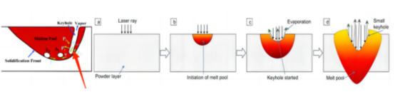 Keyhole definition: When the radiation irradiance is greater than 10 ^ 6W/cm ^ 2, the surface of the material melts and evaporates under the action of laser. When the evaporation speed is large enough, the generated vapor recoil pressure is sufficient to overcome the surface tension and liquid gravity of the liquid metal, thereby displacing some of the liquid metal, causing the molten pool at the excitation zone to sink and form small pits; The beam of light directly acts on the bottom of the small pit, causing the metal to further melt and gasify. High pressure steam continues to force the liquid metal at the bottom of the pit to flow towards the periphery of the molten pool, further deepening the small hole. This process continues, ultimately forming a keyhole like hole in the liquid metal. When the metal vapor pressure generated by the laser beam in the small hole reaches equilibrium with the surface tension and gravity of the liquid metal, the small hole no longer deepens and forms a depth stable small hole, which is called the “small hole effect”.
