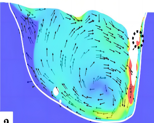 As the laser beam moves relative to the workpiece, the small hole shows a slightly backward curved front and a clearly inclined inverted triangle at the back. The front edge of the small hole is the action area of the laser, with high temperature and high vapor pressure, while the temperature along the back edge is relatively low and the vapor pressure is small. Under this pressure and temperature difference, the molten liquid flows around the small hole from the front end to the back end, forming a vortex at the back end of the small hole, and finally solidifies at the back edge. The dynamic state of the keyhole obtained through laser simulation and actual welding is shown in the above figure, The morphology of small holes and the flow of surrounding molten liquid during travel at different speeds.