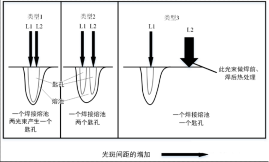 Type 3: Further increase the spot spacing and change the energy ratio of the two beams, so that one of the two beams is used as a heat source to perform pre-welding or post-welding processing during the welding process, and the other beam is used to generate small holes. For type 3, the study found that the two beams form a keyhole, the small hole is not easy to collapse, and the weld is not easy to produce pores.