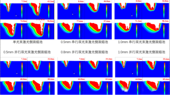 After understanding the implementation of double beams, let’s briefly introduce the welding principles and methods. In the double-beam laser welding process, there are three common beam arrangements, namely serial arrangement, parallel arrangement and hybrid arrangement. cloth, that is, there is a distance in both the welding direction and the welding vertical direction. As shown in the last row of the figure, according to the different shapes of small holes and molten pools that appear under different spot spacing during the serial welding process, they can be further divided into single melts. There are three states: pool, common molten pool and separated molten pool. The characteristics of single molten pool and separated molten pool are similar to those of single laser welding, as shown in the numerical simulation diagram. There are different process effects for different types.