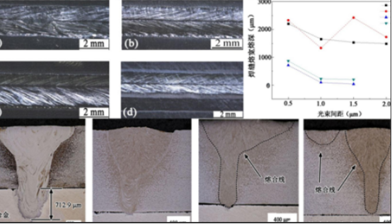 When the laser power is 2.8kW, the welding speed is 33mm/s, the defocus amount is 0mm, and the beam energy ratio RS=0.67, change the beam spacing (d=0.5mm, 1mm, 1.5mm, 2mm) to obtain the weld surface morphology as the picture shows. When d=0.5mm, 1mm, 1.5mm, 2mm, the surface of the weld is smooth and flat, and the shape is beautiful; the fish scale pattern of the weld is regular and beautiful, and there are no visible pores, cracks and other defects. Therefore, under the four beam spacing conditions, the weld surface is well formed. In addition, when d=2 mm, two different welds are formed, which shows that the two parallel laser beams no longer act on a molten pool, and cannot form an effective dual-beam laser hybrid welding. When the beam spacing is 0.5mm, the weld is “funnel-shaped”, the penetration depth P2 of the weld on the aluminum alloy side is 712.9 microns, and there are no cracks, pores and other defects inside the weld. As the beam spacing continues to increase, the penetration depth P2 of the weld on the aluminum alloy side decreases significantly. When the beam spacing is 1 mm, the penetration depth of the weld on the aluminum alloy side is only 94.2 microns. As the beam spacing further increases, the weld does not form effective penetration on the aluminum alloy side. Therefore, when the beam spacing is 0.5mm, the double-beam recombination effect is the best. As the beam spacing increases, the welding heat input decreases sharply, and the two-beam laser recombination effect gradually becomes worse.