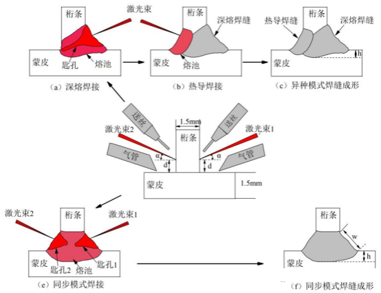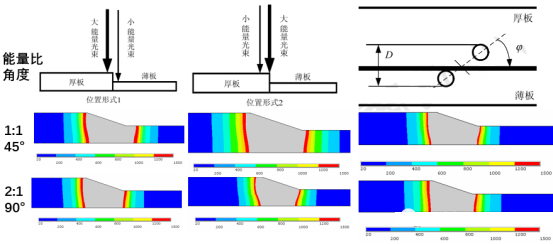 By comparing the test and calculation results, the results are in good agreement, verifying the correctness of the heat source model. The width of the weld seam under different process parameters was calculated and gradually optimized. Finally, the beam energy ratio of 2:1 was adopted, the double beams were arranged in parallel, the large energy beam was located at the center of the weld seam, and the small energy beam was located at the thick plate. It can effectively reduce the weld width. When the two beams are 45 degrees from each other. When arranged, the beam acts on the thick plate and the thin plate respectively. Due to the reduction of the effective heating beam diameter, the weld width also decreases.