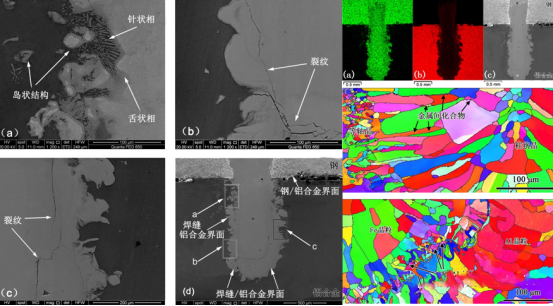 The current study draws the following conclusions: (1) As the beam energy ratio increases, the thickness of the intermetallic compound in the same position area of the weld/aluminum alloy interface gradually decreases, and the distribution becomes more regular. When RS=2, the thickness of the interface IMC layer is between 5-10 microns. The maximum length of free “needle-like” IMC is between 23 microns. When RS=0.67, the thickness of the interface IMC layer is below 5 microns, and the maximum length of free “needle-like” IMC is 5.6 microns. The thickness of the intermetallic compound is significantly reduced.