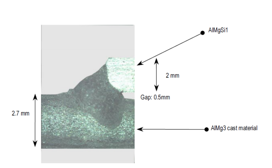 Figure 4 shows a LaserHybrid welded joint of a ALMg3 cast material with a AlMgSi sheet material. The filler wire is AlSi5 and the shielding gas used is Argon. With increasing laser power, deeper penetration is possible. Combining the laser beam with the arc in this way achieves a larger weld pool than with the laser beam weld process on its own. This makes it possible to weld components with wider gaps.
