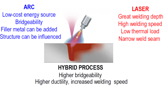 The combination of laser welding with another weld process is referred to as a “hybrid welding process”. This means that a laser beam and an arc act simultaneously in one welding zone, and influence and support one another.