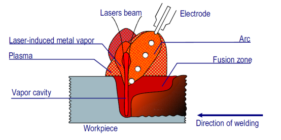 Thanks to the combination of the laser process and the arc process, there is also an increase in both the weld penetration depth and the welding speed (as compared to either of the processes used on its own). The metal vapor escaping from the vapor cavity retro-acts upon the arc plasma. Absorption of the Nd:YAG laser radiation in the processing plasma remains negligible. Depending on what ratio of the two power inputs is chosen, the character of the overall process may be determined to a greater or smaller degree either by the laser or by the arc [3,4].