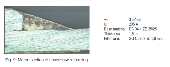 The next figure shows the cross section of a Laser Hot wire brazed material. The zinc coated material is brazed with a speed of 3 m/min and the filler wire has a current load of 205 A . The heat input is very low, therefore a low distortion is the result of the brazing process.