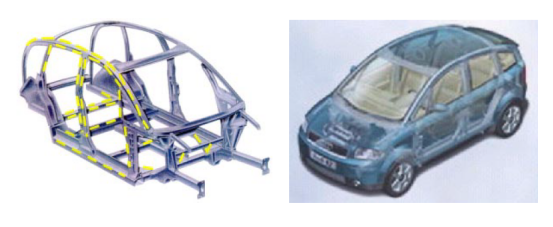 The Audi A2 Space frame consists of 30 m Laser (yellow strips in the figure 2) and 20m MIG weld length. Additionally, 1700 rivets are also used.