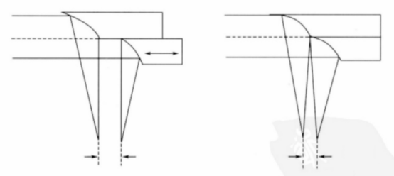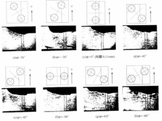 When welding plates with large gaps, you can increase the effective beam heating diameter by rotating the double beam angle to obtain good gap filling capabilities. The width of the top of the weld is determined by the effective beam diameter of the two laser beams, that is, the rotation angle of the beam. The greater the rotation angle, the wider the heating range of the double beam, and the greater the width of the upper part of the weld. The two laser beams play different roles in the welding process. One is mainly used to penetrate the seam, while the other is mainly used to melt the thick plate material to fill the gap. As shown in Figure 6-35, under a positive beam rotation angle (the front beam acts on the thick plate, the rear beam acts on the weld), the front beam is incident on the thick plate to heat and melt the material, and the following one The laser beam creates penetration. The first laser beam in the front can only partially melt the thick plate, but it contributes greatly to the welding process, because it not only melts the side of the thick plate for better gap filling, but also pre-joins the joint material so that the following beams It is easier to weld through joints, allowing for faster welding. In double-beam welding with a negative rotation angle (the front beam acts on the weld, and the rear beam acts on the thick plate), the two beams have exactly the opposite effect. The former beam melts the joint, and the latter beam melts the thick plate to fill it. gap. In this case, the front beam is required to weld through the cold plate, and the welding speed is slower than using a positive beam rotation angle. And due to the preheating effect of the previous beam, the latter beam will melt more thick plate material under the same power. In this case, the power of the latter laser beam should be appropriately reduced. In comparison, using a positive beam rotation angle can appropriately increase the welding speed, and using a negative beam rotation angle can achieve better gap filling. Figure 6-36 shows the influence of different beam rotation angles on the cross-section of the weld.