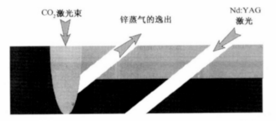 Double-beam laser welding can solve the welding quality problems caused by zinc vapor. One method is to control the existence time and cooling rate of the molten pool by reasonably matching the energy of the two beams to facilitate the escape of zinc vapor; the other method is Release zinc vapor by pre-punching or grooving. As shown in Figure 6-31, CO2 laser is used for welding. The YAG laser is in front of the CO2 laser and is used to drill holes or cut grooves. The pre-processed holes or grooves provide an escape path for zinc vapor generated during subsequent welding, preventing it from remaining in the molten pool and forming defects.