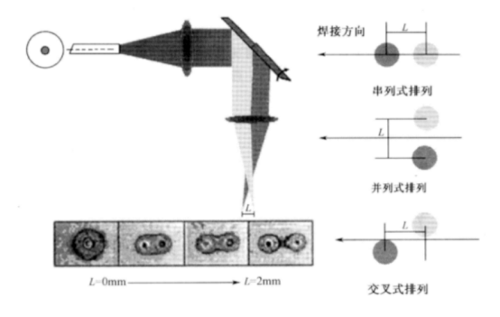 Double-beam welding means using two laser beams at the same time during the welding process. The beam arrangement, beam spacing, angle between the two beams, focusing position and the energy ratio of the two beams are all relevant settings in double-beam laser welding. parameter. Normally, during the welding process, there are generally two ways to arrange the double beams. As shown in the figure, one is arranged in series along the welding direction. This arrangement can reduce the cooling rate of the molten pool. Reduces the hardenability tendency of the weld and the generation of pores. The other is to arrange them side by side or crosswise on both sides of the weld to improve the adaptability to the weld gap.