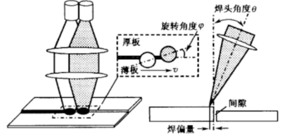 The main process parameters of Shuangguangdong’s welding of unequal thickness plates can be divided into welding parameters and plate parameters, as shown in the figure. Welding parameters include the power of the two laser beams, welding speed, focus position, welding head angle, beam rotation angle of the double-beam butt joint and welding offset, etc. Board parameters include material size, performance, trimming conditions, board gaps, etc. The power of the two laser beams can be adjusted separately according to different welding purposes. The focus position is generally located on the surface of the thin plate to achieve a stable and efficient welding process. The welding head angle is usually selected to be around 6. If the thickness of the two plates is relatively large, a positive welding head angle can be used, that is, the laser is tilted toward the thin plate, as shown in the picture; when the plate thickness is relatively small, a negative welding head angle can be used. The welding offset is defined as the distance between the laser focus and the edge of the thick plate. By adjusting the welding offset, the amount of weld dent can be reduced and a good weld cross-section can be obtained.