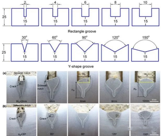 As shown in Figure 3, researchers have found that using laser arc composite welding (laser power 4kW) can fill the groove in two layers and two passes, effectively improving welding efficiency; A defect free welding of 20mm thick MnDR was achieved using a three-layer laser arc composite welding (laser power of 6kW); Laser arc composite welding was used to weld 30mm thick low-carbon steel in multiple layers and passes, and the cross-sectional morphology of the welded joint was stable and good. In addition, researchers have found that the width of rectangular grooves and the angle of Y-shaped grooves have a significant impact on the spatial constraint effect. When the width of the rectangular groove is ≤ 4mm and the angle of the Y-shaped groove is ≤ 60 °, the cross-section morphology of the weld seam shows central cracks and side wall notches, as shown in the figure.