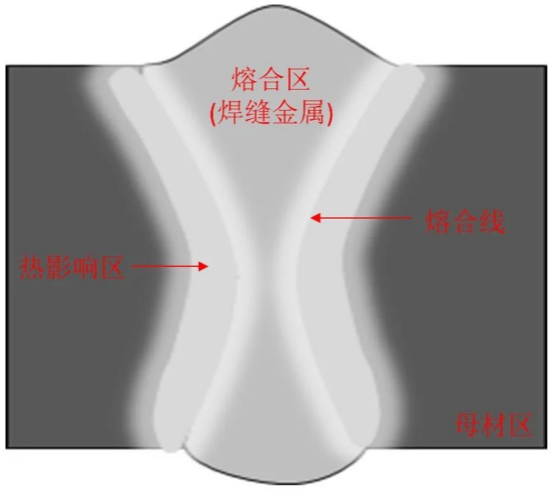 A welded joint refers to a joint where two or more workpieces are connected by welding. The welded joint of fusion welding is formed by local heating from a high-temperature heat source. The welded joint consists of a fusion zone (weld zone), fusion line, heat affected zone, and base metal zone, as shown in the figure.