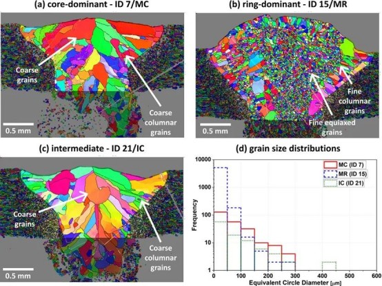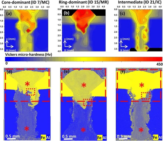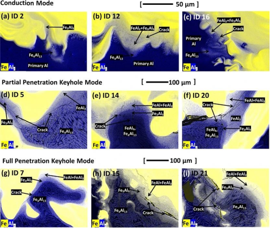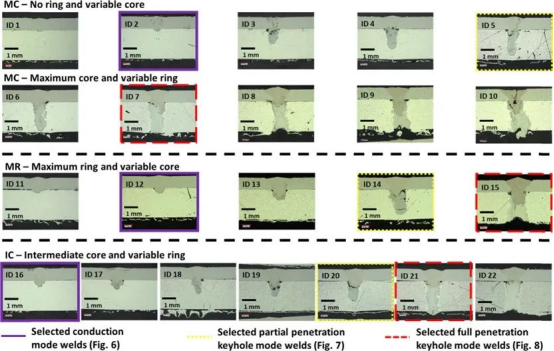 IC test: Conducted mode (ID 16 and 17) was achieved at 1500w core power and 3000w and 3500w ring power. When the core power is 3000w and the ring power is between 1500w and 2500w (ID 19-20), obvious cracks appear at the interface between rich iron and rich aluminum, forming a local penetrating small hole pattern. When the ring power is 3000 and 3500w (ID 21 and 22), achieve full penetration keyhole mode.