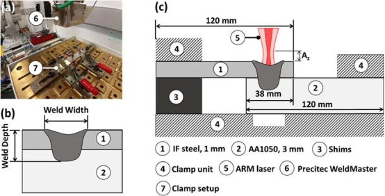 (a) Welding device; (b) The depth and width of the weld profile; (c) Schematic diagram of displaying sample and fixture settings