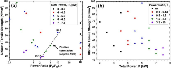 Figure 4. (a) The relationship between ultimate tensile strength (UTS) and power ratio in welding tests; (b) The total power of all welding tests