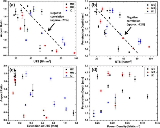 Figure 5. (a) Relationship between aspect ratio and UTS; (b) The relationship between extension and penetration depth and UTS; (c) Power density for all welding tests