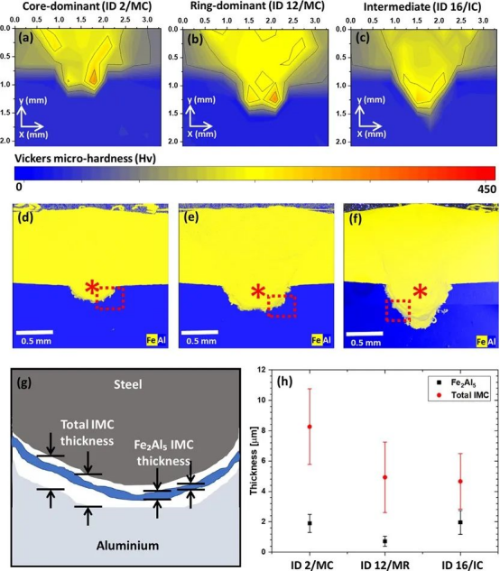 Figure 6. (a-c) Vickers microhardness indentation contour map; (d-f) Corresponding SEM-EDS chemical spectra for representative conduction mode welding; (g) Schematic diagram of the interface between steel and aluminum; (h) Fe2Al5 and total IMC thickness of conductive mode welds